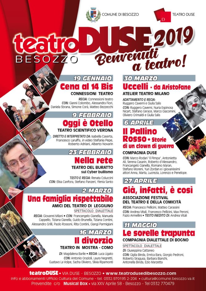 Stagione 2019. Benvenuti a teatro! Posted on 2 gennaio 2019 by teatrodusedibesozzo Condividi: Condividi su X (Si apre in una nuova finestra) X Condividi su Facebook (Si apre in una nuova finestra) Facebook Mi piace Caricamento... Correlati